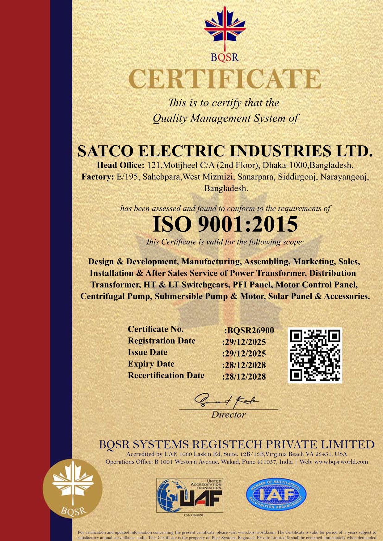 ISO 9001 : 2015 (SATCO Electric Industries Ltd.)